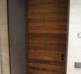 Türblatt innen mit Altholz belegt; Außen mit Spachteltechnik; Rahmen Eiche massiv; Beschläge in Edelstahl; Maße: 220 x 90 x 12 cm
