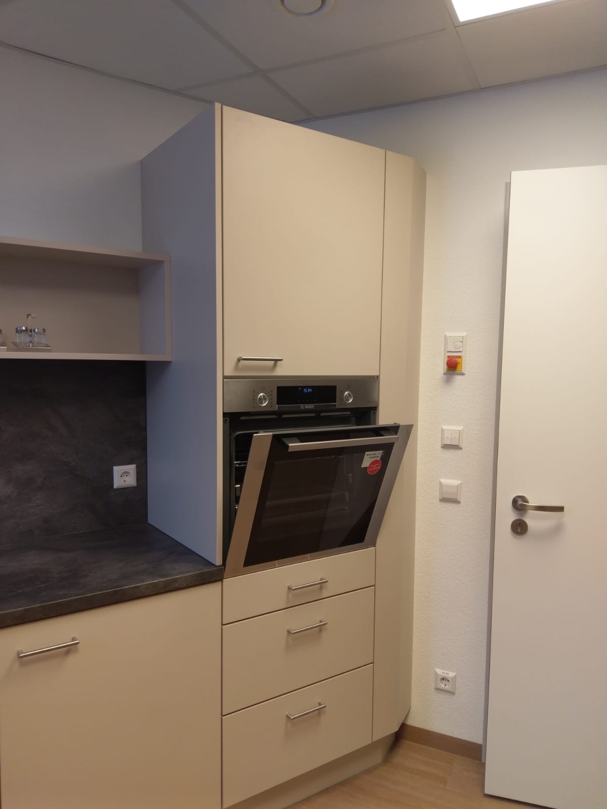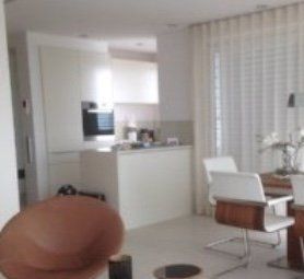 Küche in MDF; weiß lackiert; grifflos; inkl. elektrische Betätigung der Auszüge; Arbeitsplatte Granit