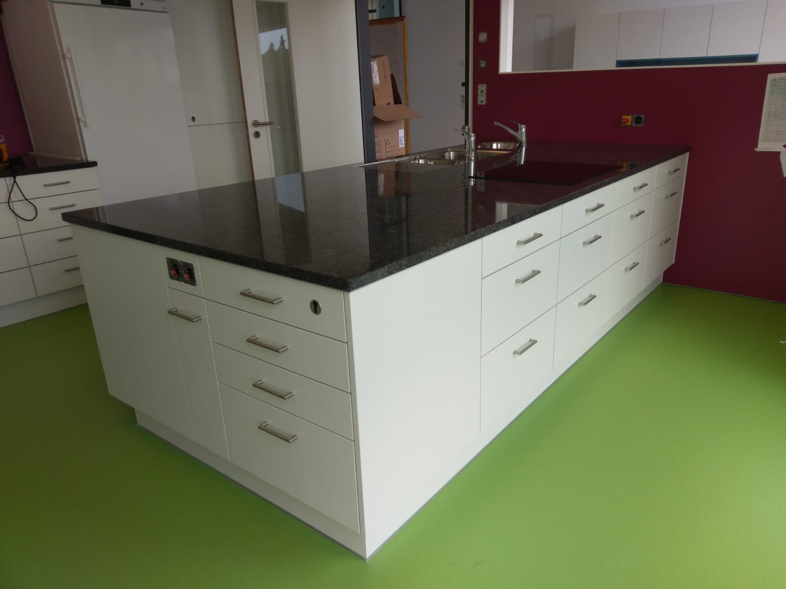 Küche weiß; kunstoffbeschichtet; Relinggriffe aus Edelstahl; Arbeitsplatte kunstoffbeschichtet mit Granitoptik; Mitteltisch mit Edelstahlfüßen und Kochfeld