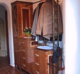 Garderobe in Kirschbaum furniert und lackiert; inkl. Intarsienarbeiten mit Nussbaum- und Ahornholz; hochglanzlackiert; inkl. geschmiedeten Matallgitterornamente; Maße: 200 x 200 x 50 cm